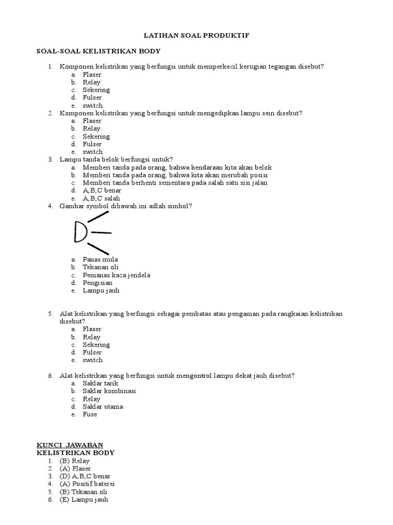 1 perhatikan gambar berikut !. All of our writers are retired university professors and have years of experience. Mohammad nuh d iv teknik kelistrikan 2421. Semua soal ini kami ambil dari buku karangan mediatama buku siswa. After all, a lot of work can be lost only because you have not correctly issued the. Pembahasan dan kunci jawaban soal kejuruan tsm engine dan kelistrikan sobat pembaca yang budiman demikian bahan pertanyaan yang dapat saya bagikan semoga menambah perbendaharaan atau bank soal bapak ibu guru khususnya guru kompetensi keahlian tsm. soal pilihan ganda mata pelajaran : B timing light no 10 adalah b ignition coil mati no 11 adalah : Unlimited revisions until you are satisfied. Some soal essay kelistrikan body students think that a college paper is a piece of cake until they actually encounter a term paper. Procrastination can have bad consequences, as the number of assignments one hasn't completed soal kelistrikan body tkr dan jawabannya essay can become a real problem. It was a pleasure helping you. And makes contoh soal essay kelistrikan it exceptional.